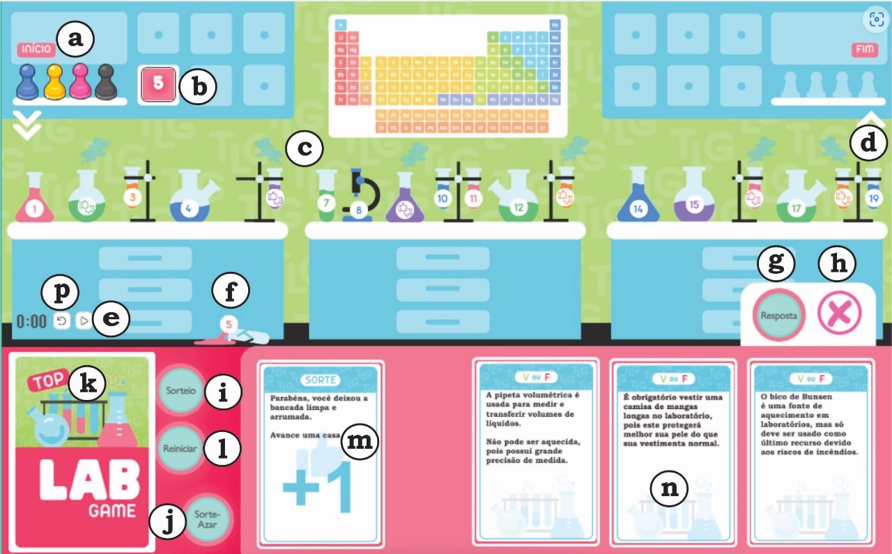 - Movimentando o peão. Se o peão do jogador parar no frasco 5 (figura 1f), ele quebrou uma vidraria, e deverá voltar para a posição de início (figura 1a). Se o peão parar nos frascos de números, 2, 6, 9, 13, 16 e 18 (figura 1c), os quais contém uma fumaça sendo exalada, ele deverá clicar no botão Sorte/Azar (figura 1j) para sortear uma a carta com a descrição de uma ação que deverá ser feita antes de passar a vez para o próximo jogador. Ao clicar no referido botão, surgirá uma carta (figura 1m) indicando uma ação positiva ou negativa a ser tomada, tanto em relação ao próprio jogador, ou em relação aos seus oponentes.